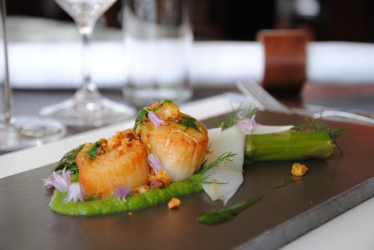 Halstrad pilgrimsmussla med sparris och ramslökspesto