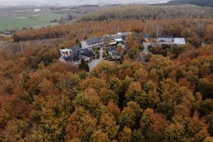 The Treetop Lodge comprises 12 double rooms and a suite. Each room is approximately 25 sqm and features a desk, chair, and at least one armchair or rocking chair, along with a wardrobe. Spacious toilet & shower facilities are included. Many of these rooms were redecorated in spring 2018 with Lexington wallpapers and textiles. These spacious rooms are ideal if you require an extra bed. Room No. 7 on the ground floor is wheelchair accessible. Every room offers a panoramic view over the treetops towards the undulating landscape to the west. In 2020, we removed TVs from the rooms to enhance your sensory experience with nature, cuisine, and surroundings during your stay.