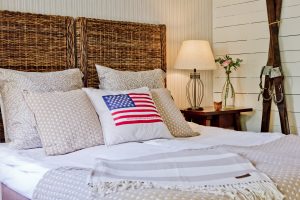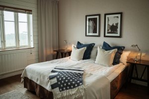 Perched atop Romeleåsen, one of the highest elevations in Skåne at 167 meters above sea level, The Lodge offers 22 double rooms and a total of 44 beds. The Treetop Lodge features 12 double rooms and a suite, each boasting breathtaking views of the rolling Skåne landscape to the west. Additionally, there are nine Lexington Cabins (individual houses redesigned with Lexington wallpapers & textiles), three of which are completely detached, while the remaining six are paired in twos, sharing a quaint veranda between them. All cabins are nestled amid lush greenery, connected to the main facilities by illuminated wooden walkways. Every room meets the same high standards and is decorated in a New England style with varying color schemes. All rooms feature twin beds with separate mattresses, except the suite & cabin number 18 which include a double bed with a 1.60 cm mattress.